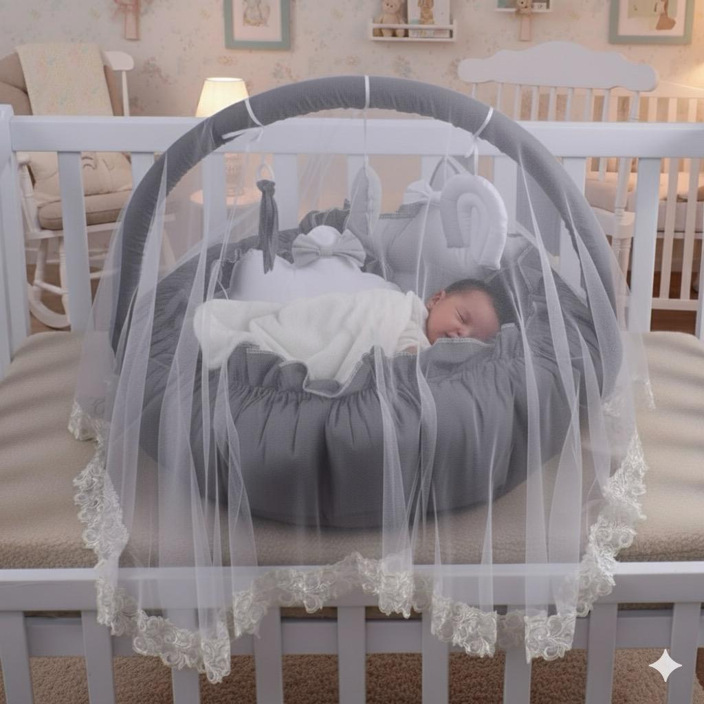 Cotton Baby Round Cot With Pillows & Mosquito Net- Dark Gray