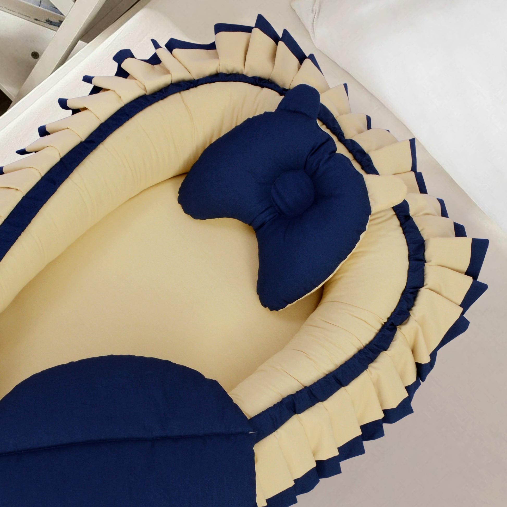 Double Frilly Cotton baby Nest with Pillow-Yellow & Navy Blue