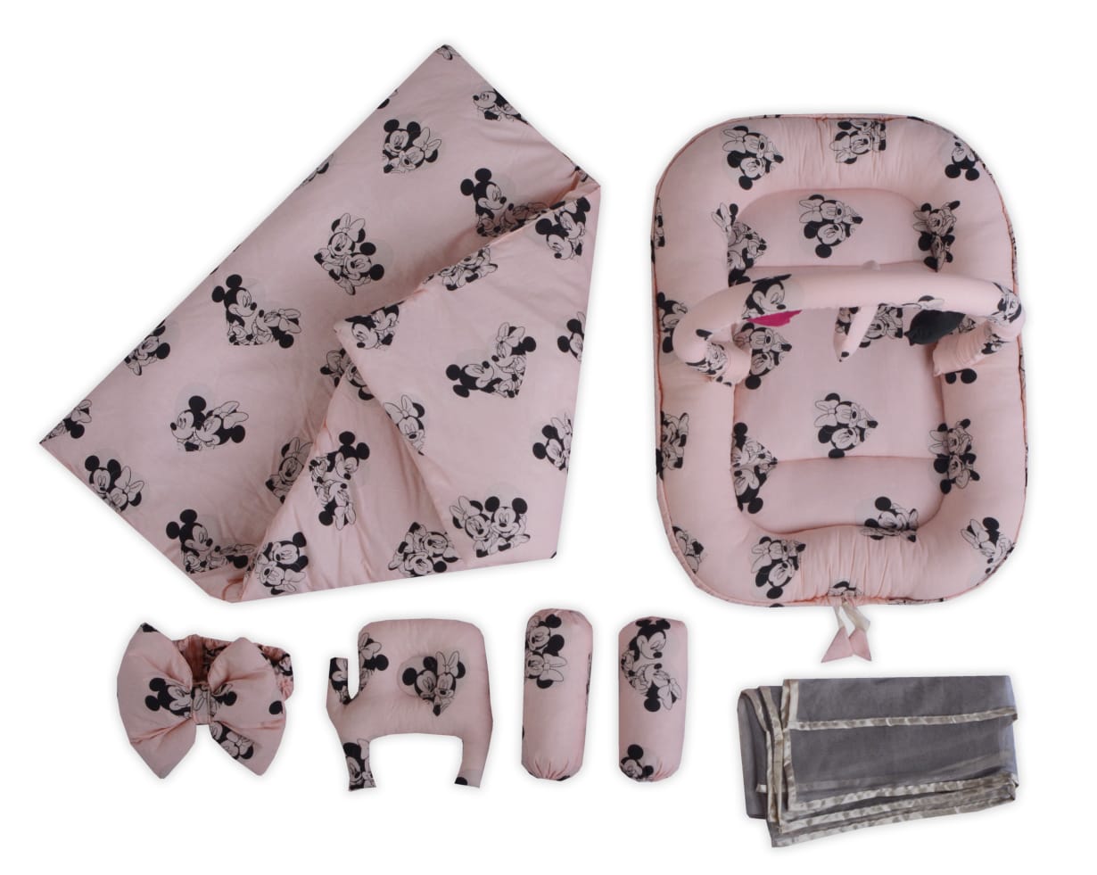 Micky Mouse Printed Baby Bed Set-7 Pcs- Peach